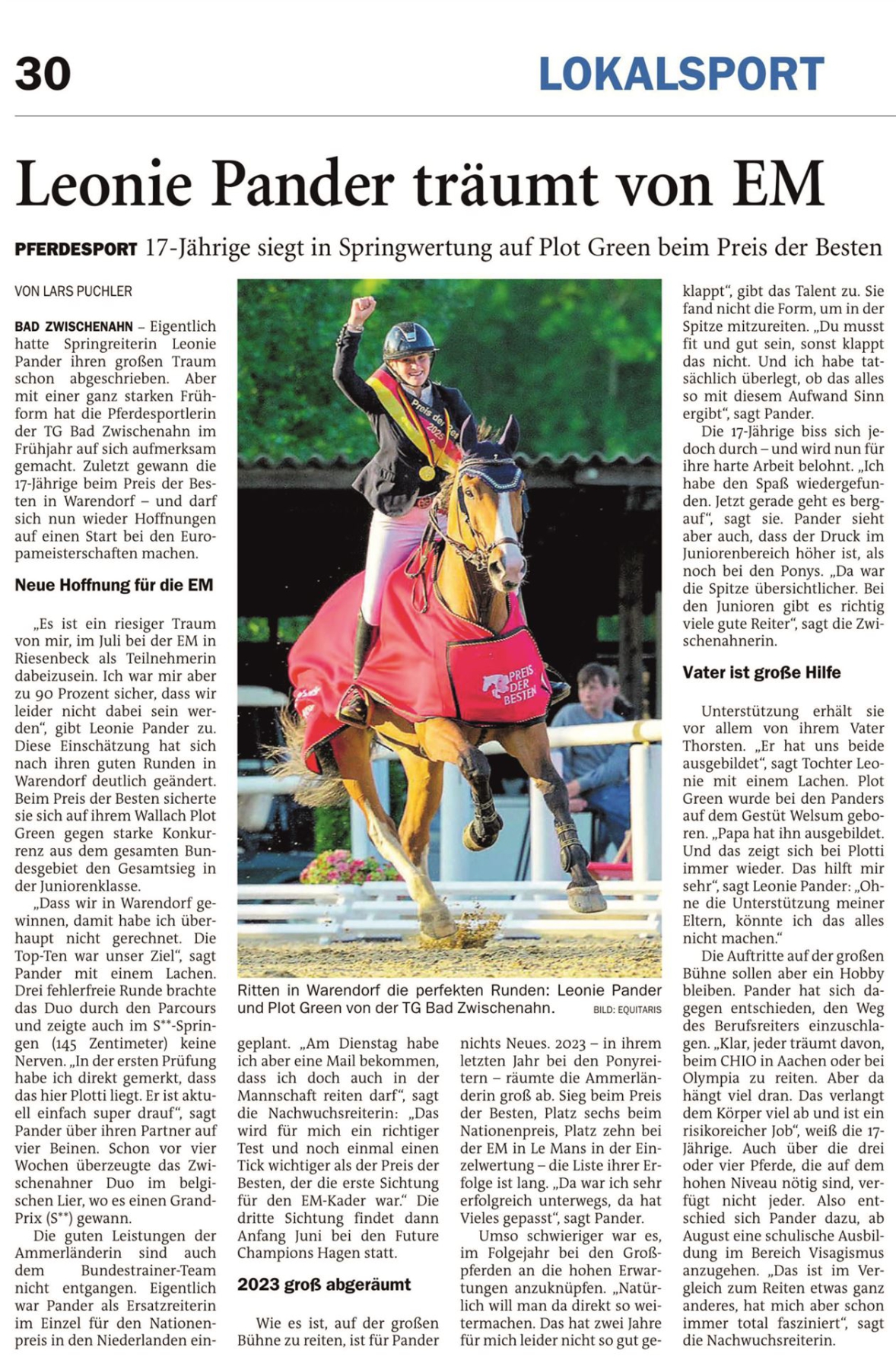 Leonie Pander wird Achte in Warendorf 20.05.2021 Artikel NWZ